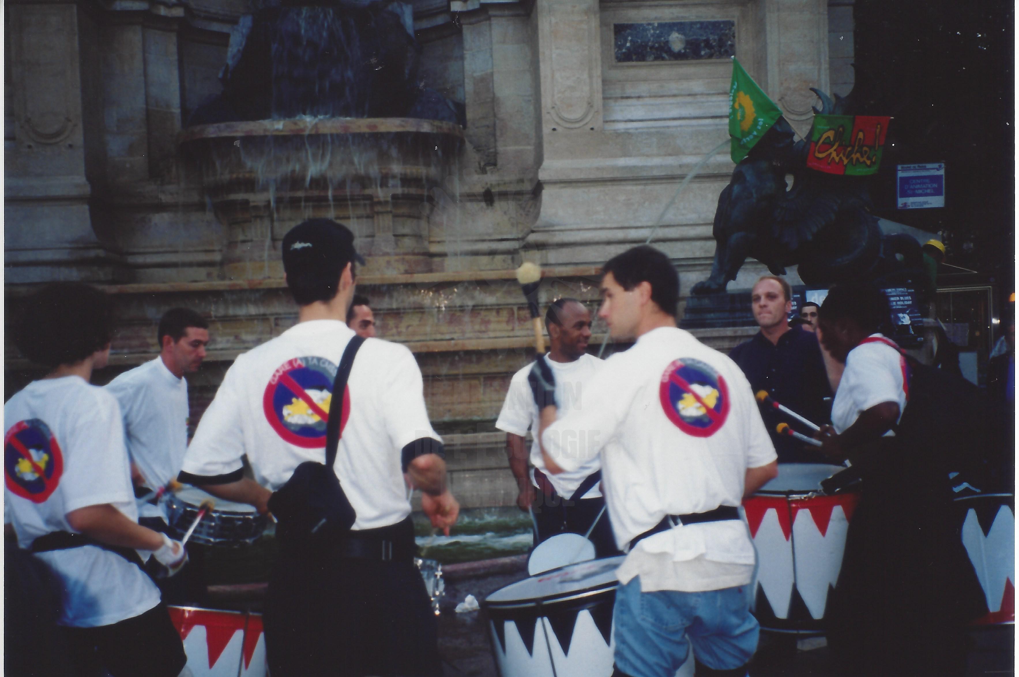 Tirage photographique pris par Serge Rivret d'une action de Chiche ! et des jeunes verts organisée pour la deuxième journée sans voiture le 22 septembre 1999 autour de la fontaine Saint-Michel à Paris (voir le tract FI/TRA/582 correspondant).