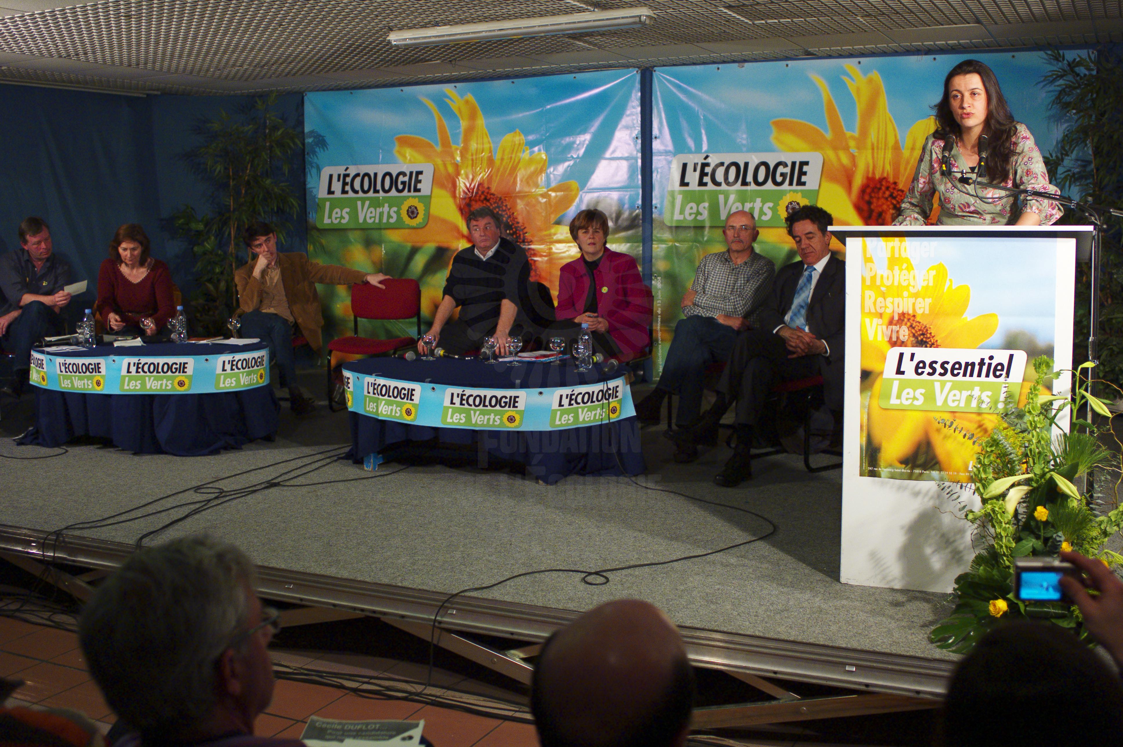 Cette photographie de Cécile DUFLOT à la tribune a été prise le 28 mars 2006 lors d'une réunion à Hellesmes dans le Nord-Pas-de-Calais en vue de la préparation des primaires pour l'élection présidentielle de 2007.