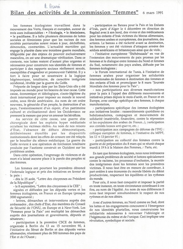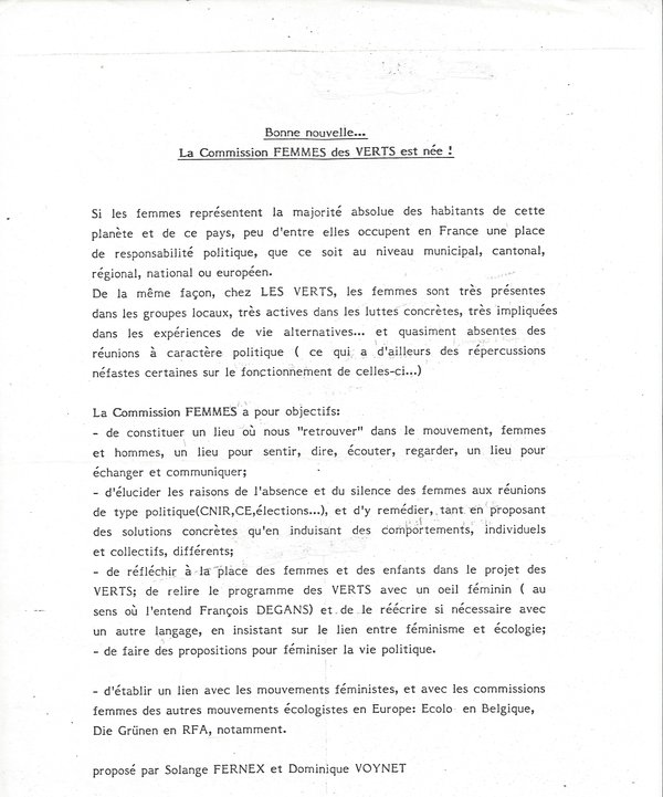 La commission femmes du parti EELV a a été créée fin 1985-début 1986. Elle se dénomme aujourd'hui commission Féminisme. « Elle agit pour faire du mouvement de l’écologie politique, EELV, un mouvement féministe dans son projet politique comme dans ses pratiques. »